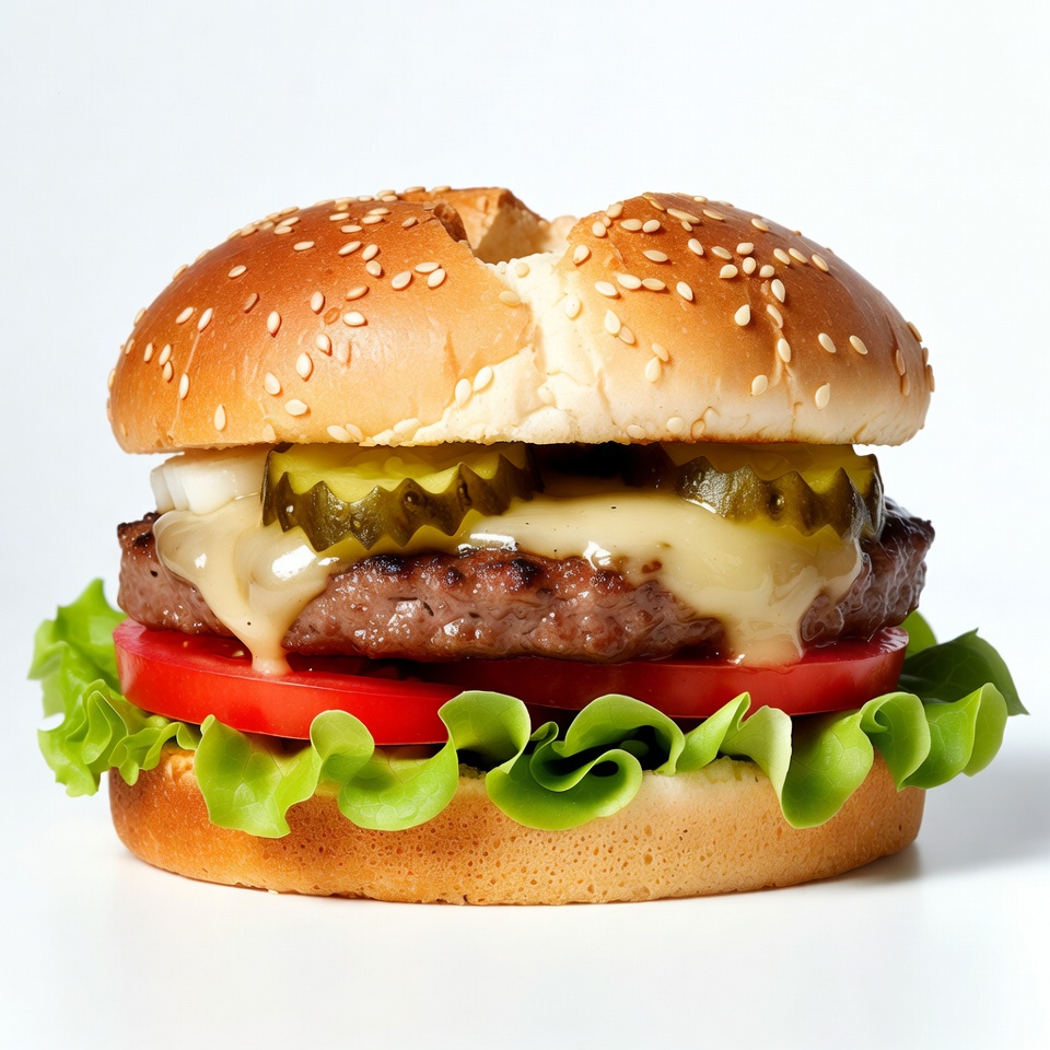 A burger with lettuce, tomato, pickles, and cheese sits on a clean surface. The bun is toasted and sesame seeds are visible.