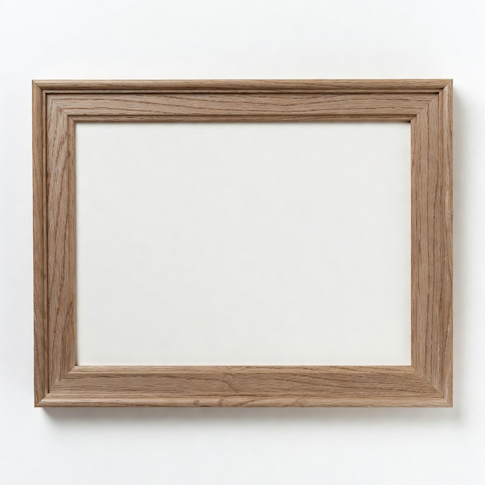 A wooden frame is placed against a white wall. The frame has no picture inside. It shows a simple design and natural color.