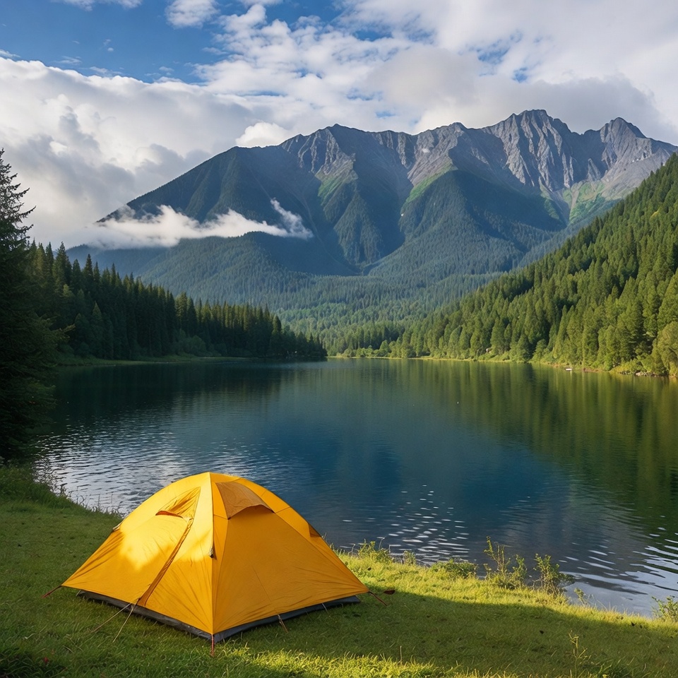 A yellow tent is pitched near a lake surrounded by tall trees and mountains in summer. Clouds drift above the peaks, reflecting in the water.