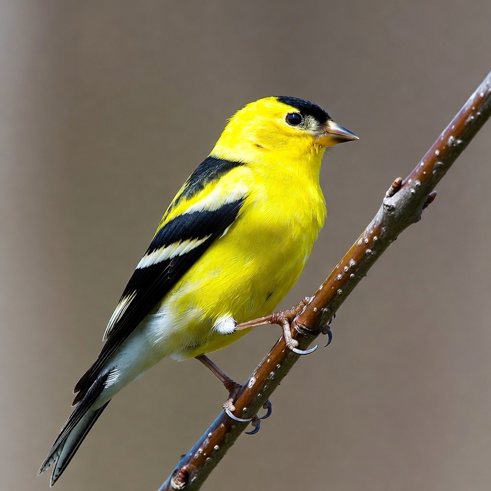 A small yellow bird stands on a thin branch in a natural setting during the day. It looks around with interest.
