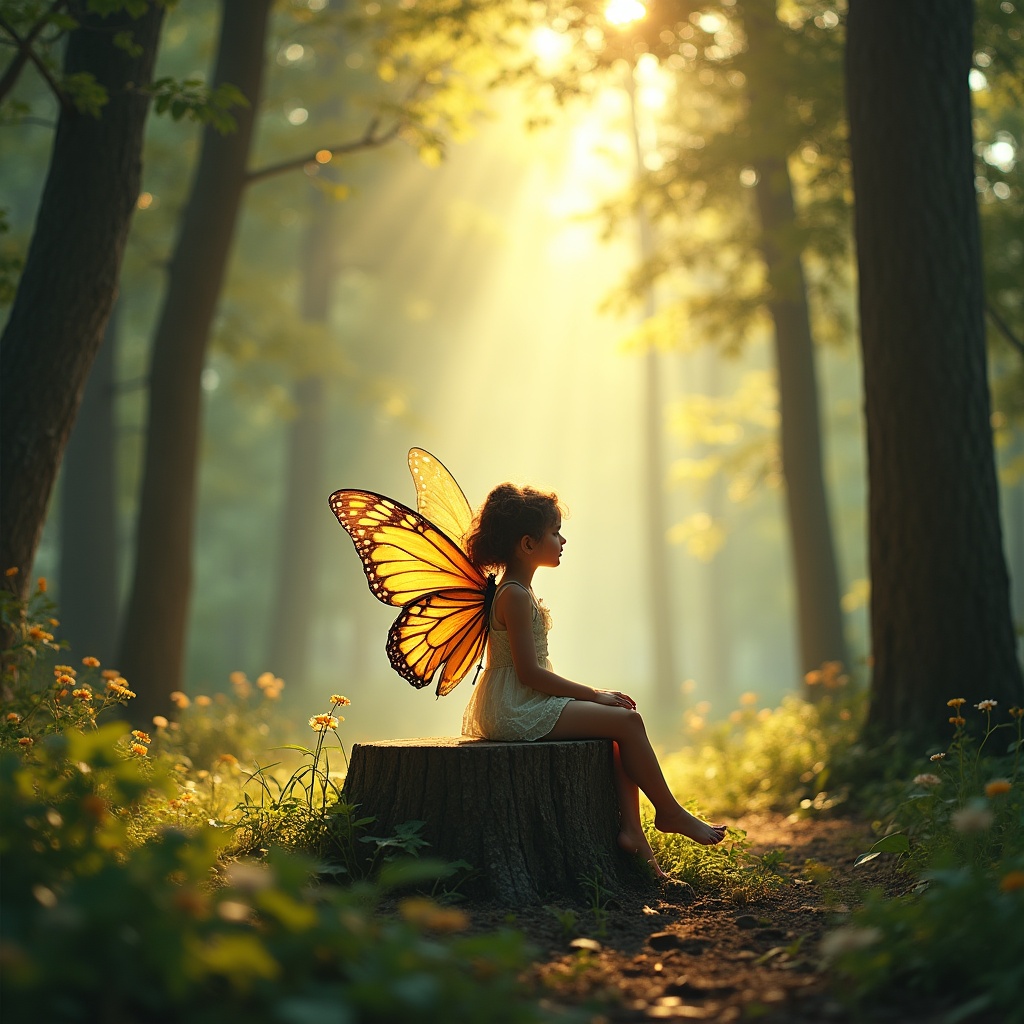 A child sits on a tree stump in a forest, wearing butterfly wings, with sunlight streaming through trees and illuminating flowers.