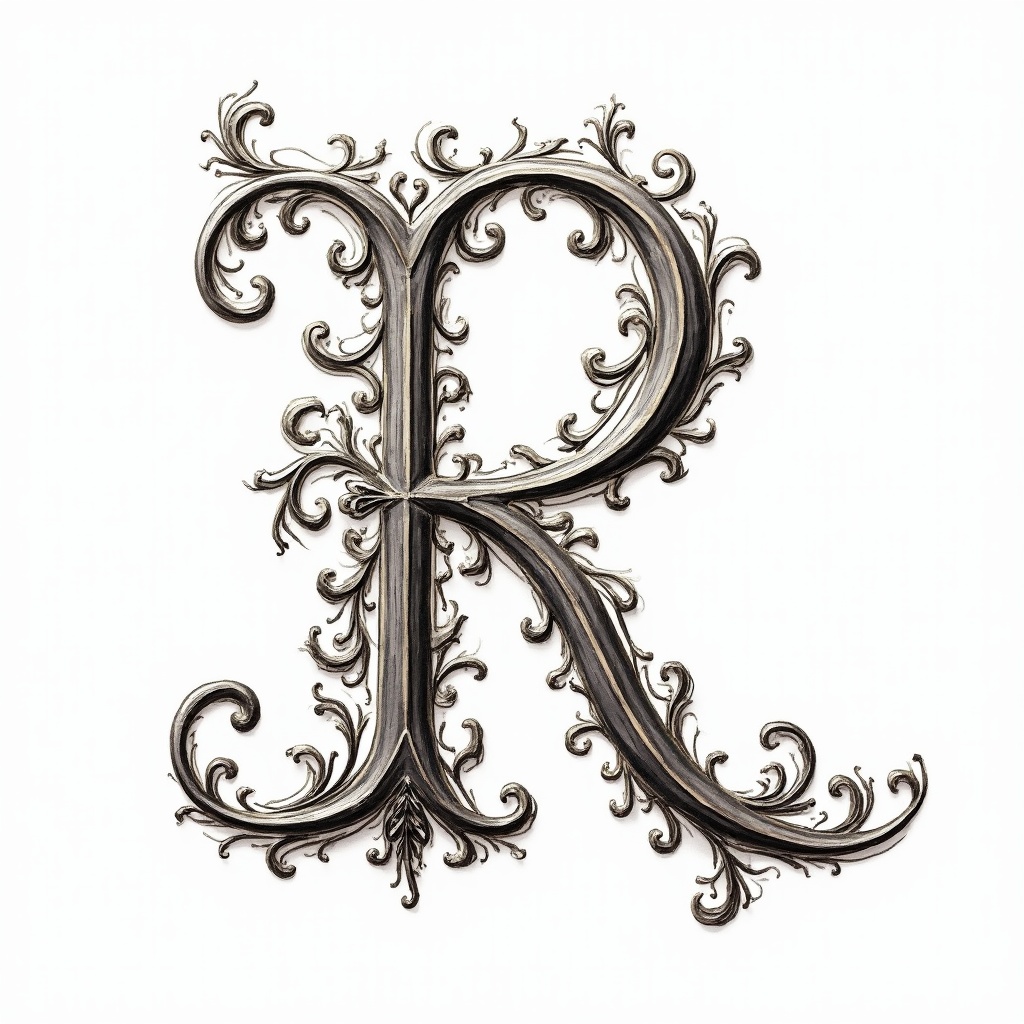 A letter R is drawn with intricate swirl patterns in black and white colors on a plain background. The design shows fine details and curves.