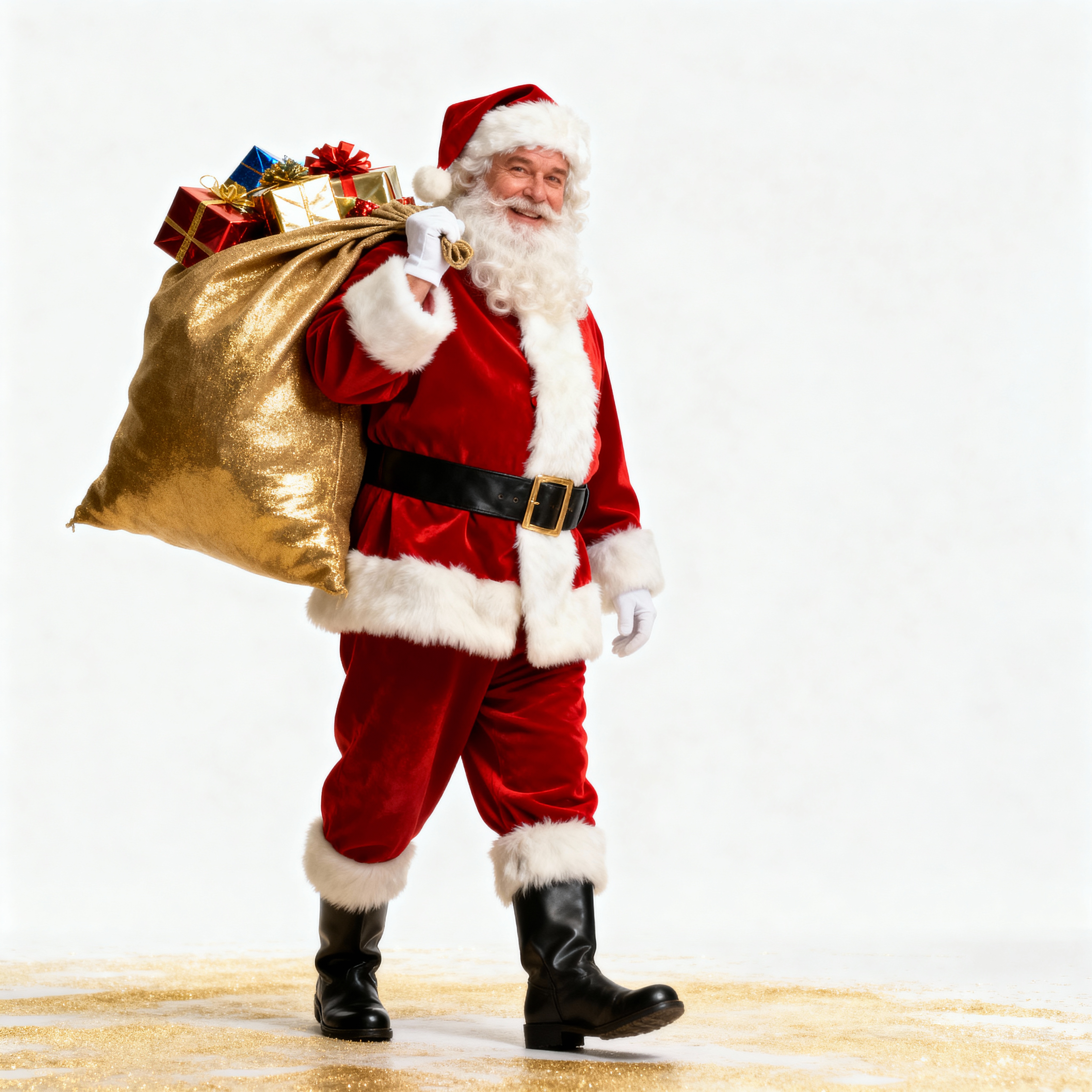 Santa Claus stands with a large bag of gifts on his shoulder. He wears his classic red suit and black boots, smiling brightly.