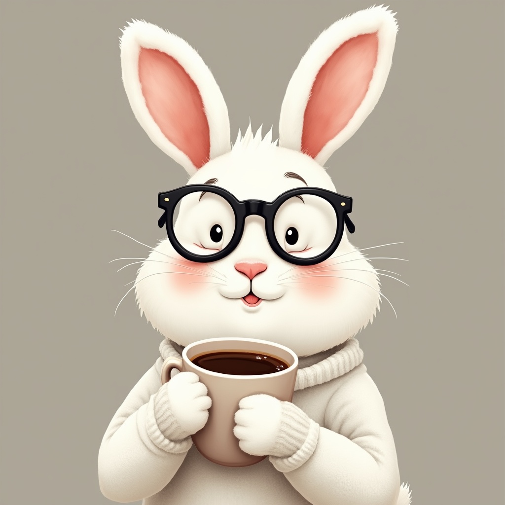 animal, cartoon, casual, character, coffee, cozy, cup, cute, drink, enjoying, friendly, hot beverage, indoors, morning, pet, rabbit, smiling, sweater, wearing glasses, whimsical