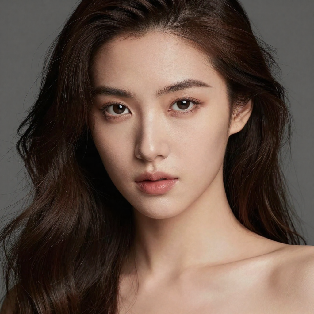 beauty, calm, close-up, confidence, dark hair, direct gaze, eyes, face, fashion, features, hairstyle, light, makeup, model, neutral background, portrait, serious expression, skin, style, woman