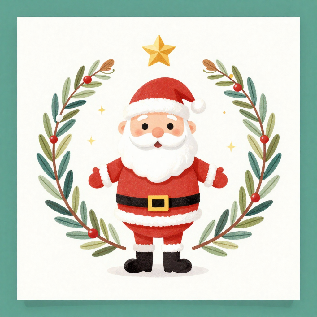 Santa stands in front of a festive wreath and a star. He wears a red suit and has a joyful expression as he spreads holiday cheer.