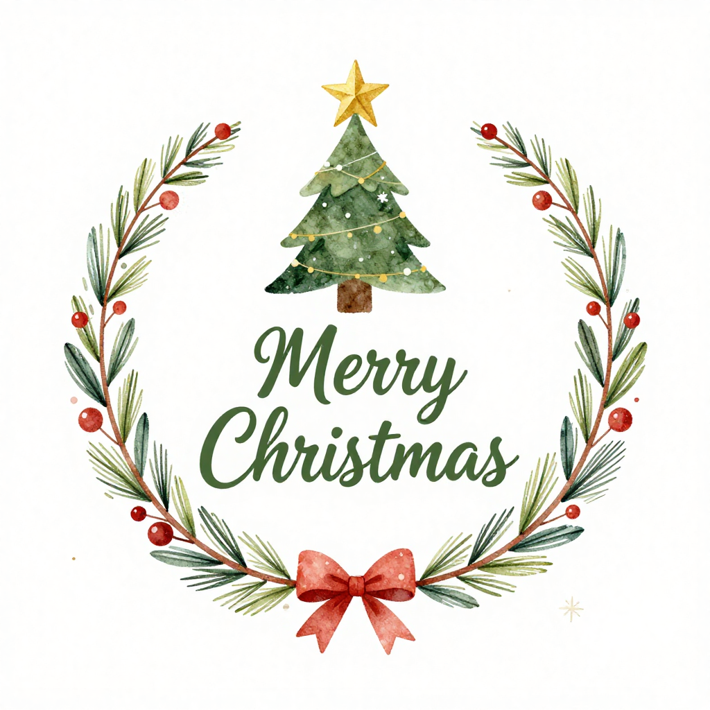 A Christmas tree stands in the center, surrounded by a wreath. The design also shows red berries, green leaves, and a bow with a star on the tree.
