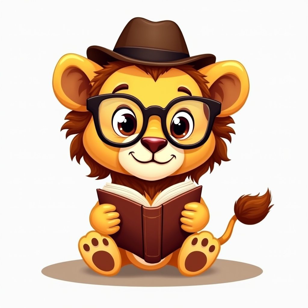 A cartoon lion sits with a book in its paws, wearing glasses and a hat. It looks focused on the text while relaxing on the ground.