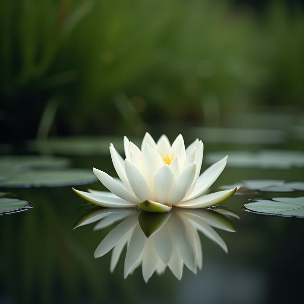 A white lily floats on the surface of calm water, reflecting its petals. Green plants surround the water. This scene captures nature’s beauty.