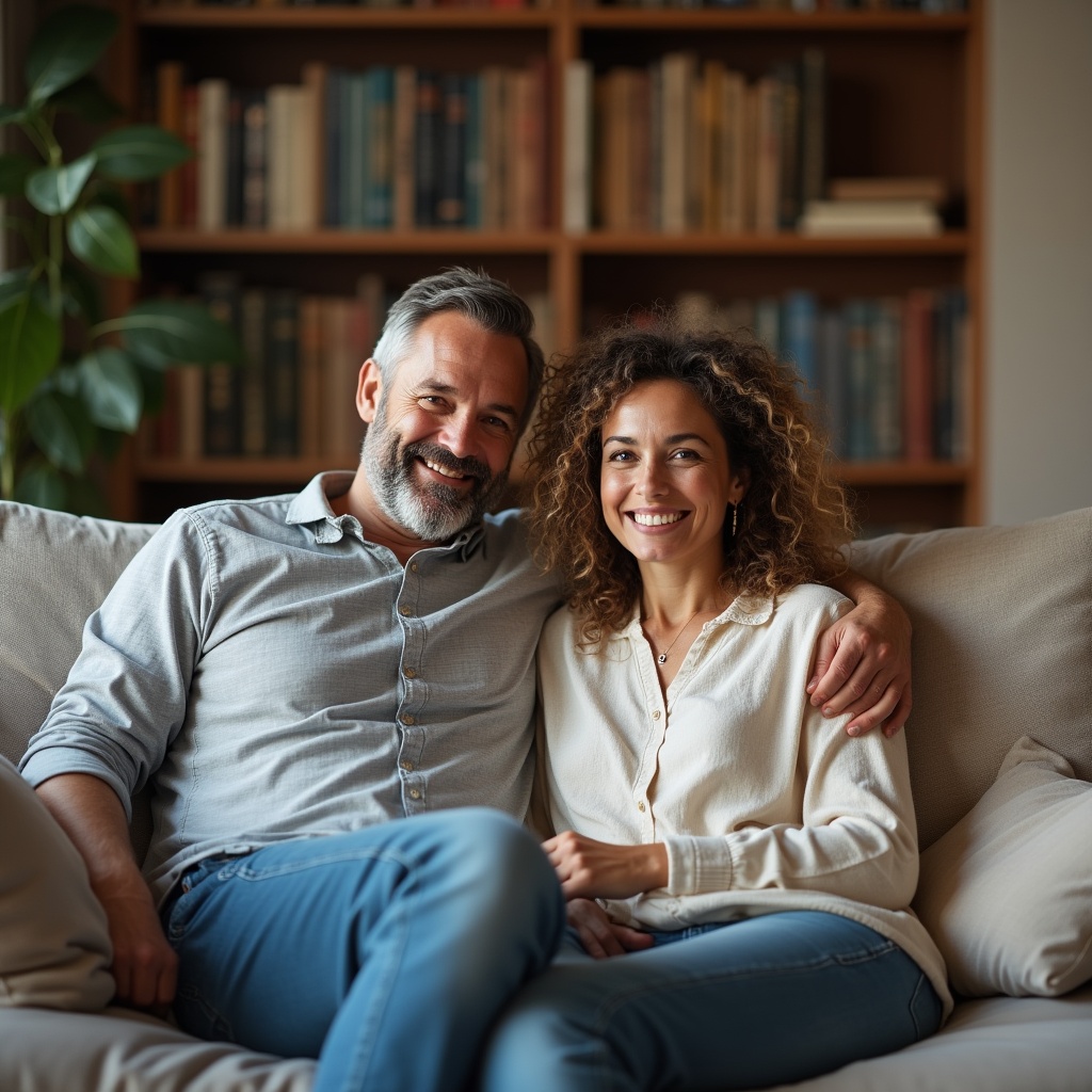 Two people sit closely on a sofa in a cozy room filled with books. They smile at each other, showing a sense of connection and happiness.