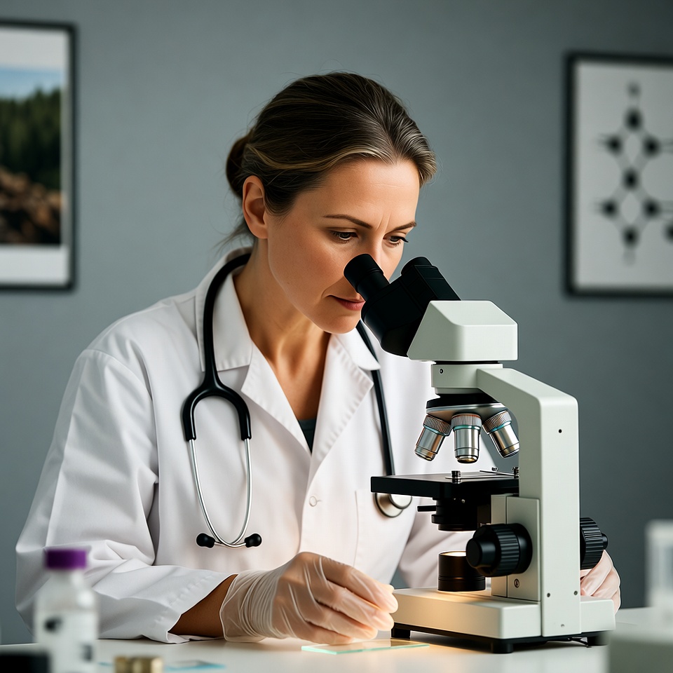 A scientist examines a sample under a microscope in a lab. The workspace has charts and equipment ready for research tasks.