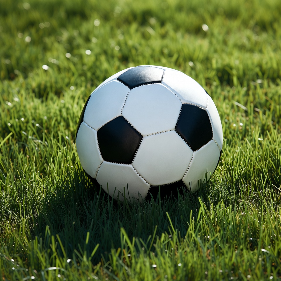 A soccer ball rests on green grass under sunlight. The ball shows classic black and white pattern, ready for play or practice.