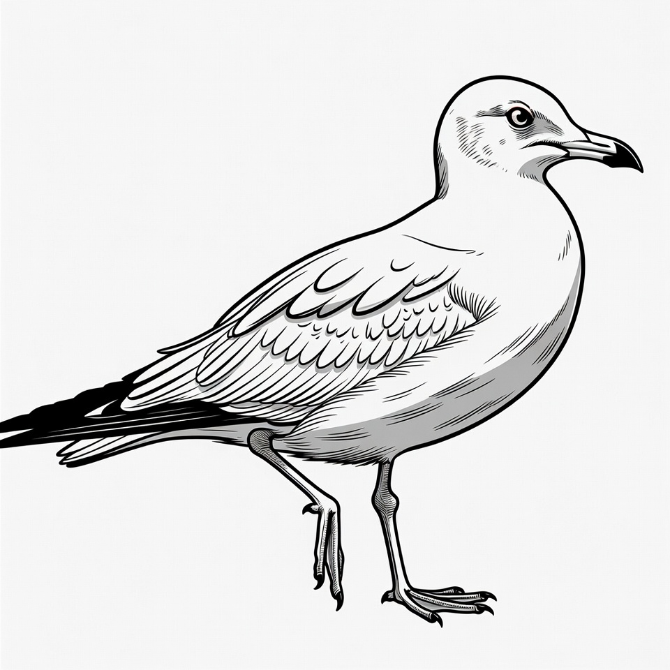 A seagull walks along the shore near the water under a clear sky. Its feathers are white and gray as it searches for food along the sand.
