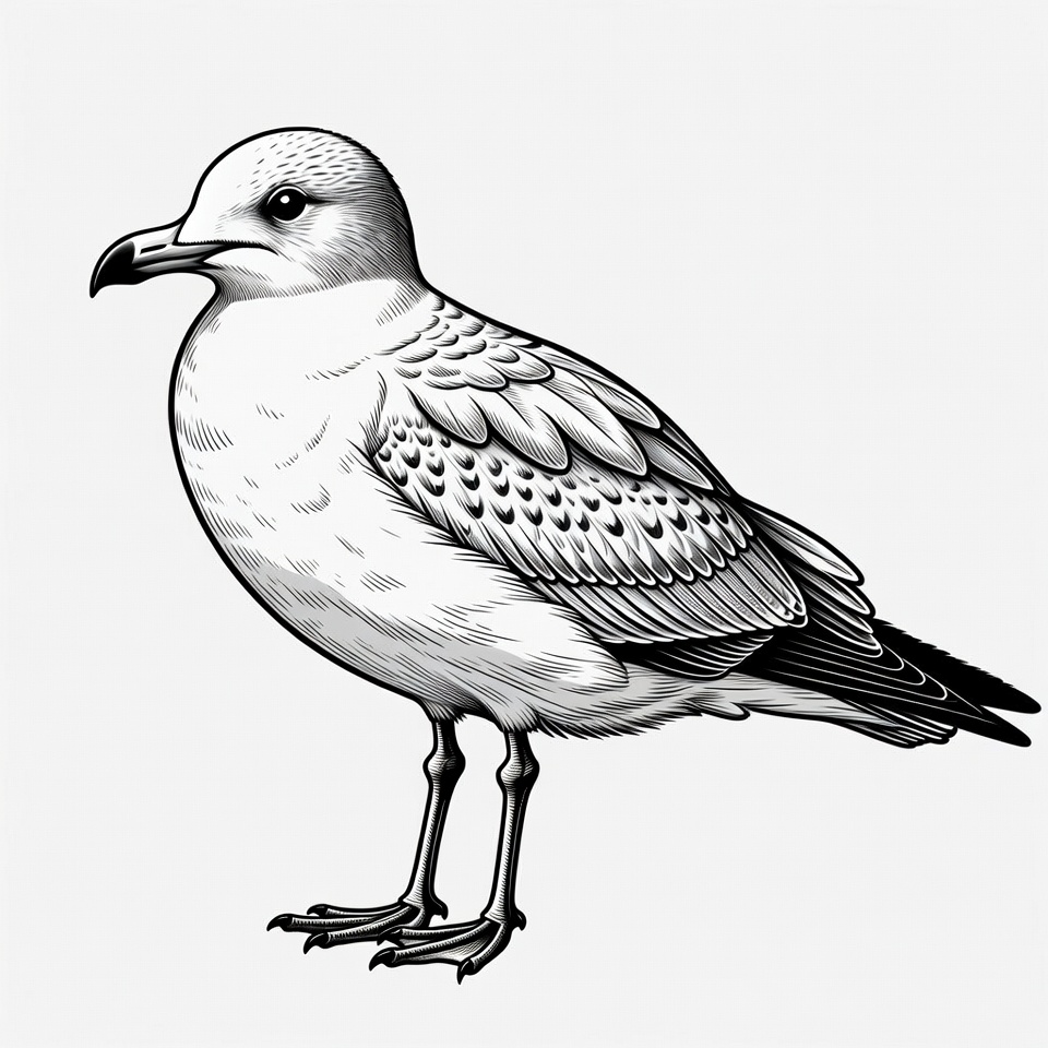 Seagull stands on sandy ground looking around. It has a detailed appearance showing feathers and posture. The setting is natural and simple.