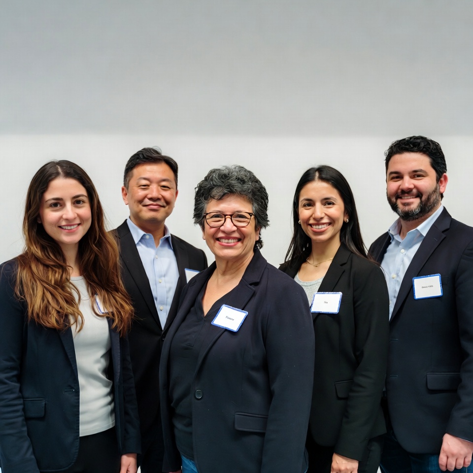 Five professionals are standing together for a group photo at a conference. They are wearing business attire and smiling for the camera.