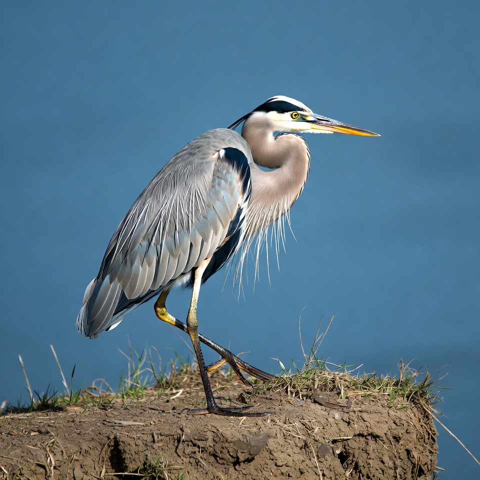 A great blue heron stands on a muddy bank near water. It looks for fish and other food while sunlight reflects on the water surface.