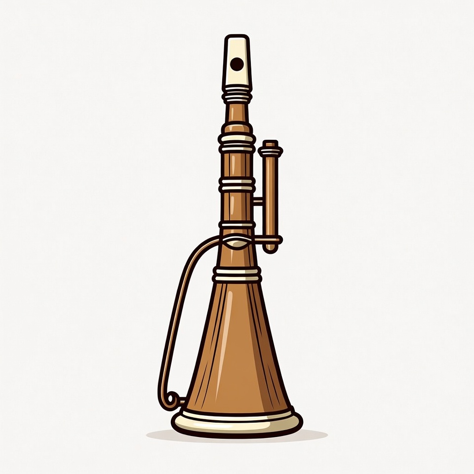 A wooden woodwind instrument stands upright against a plain background. It features a long body and a bell-shaped end.