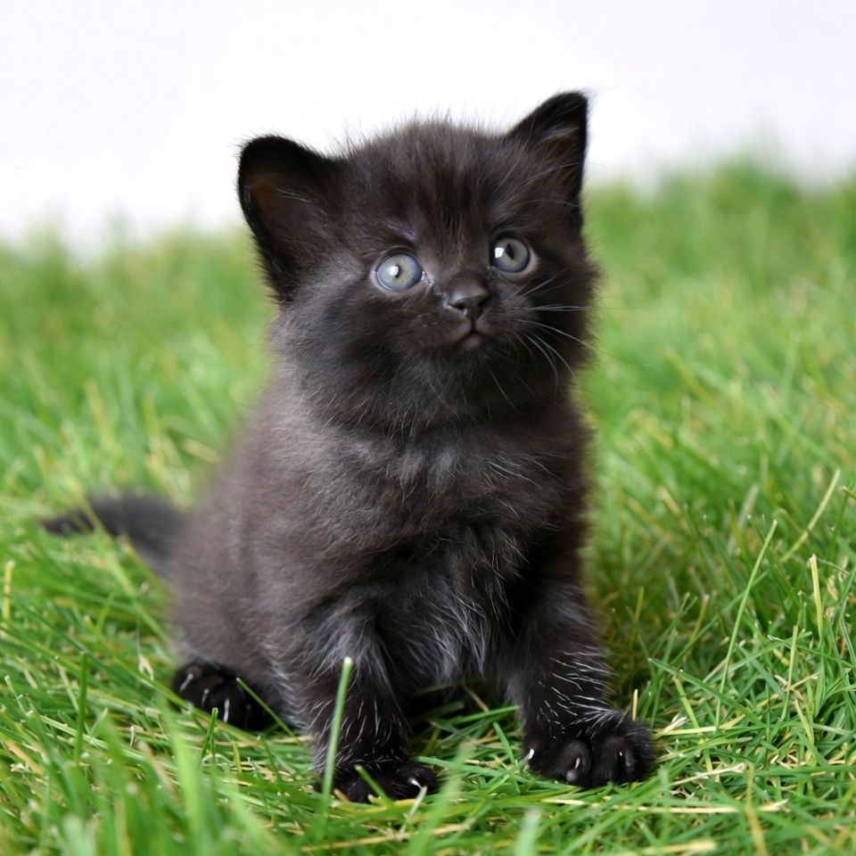 A small black kitten sits on green grass looking curious. The kitten's fur is soft, and it appears playful in the outdoor setting.