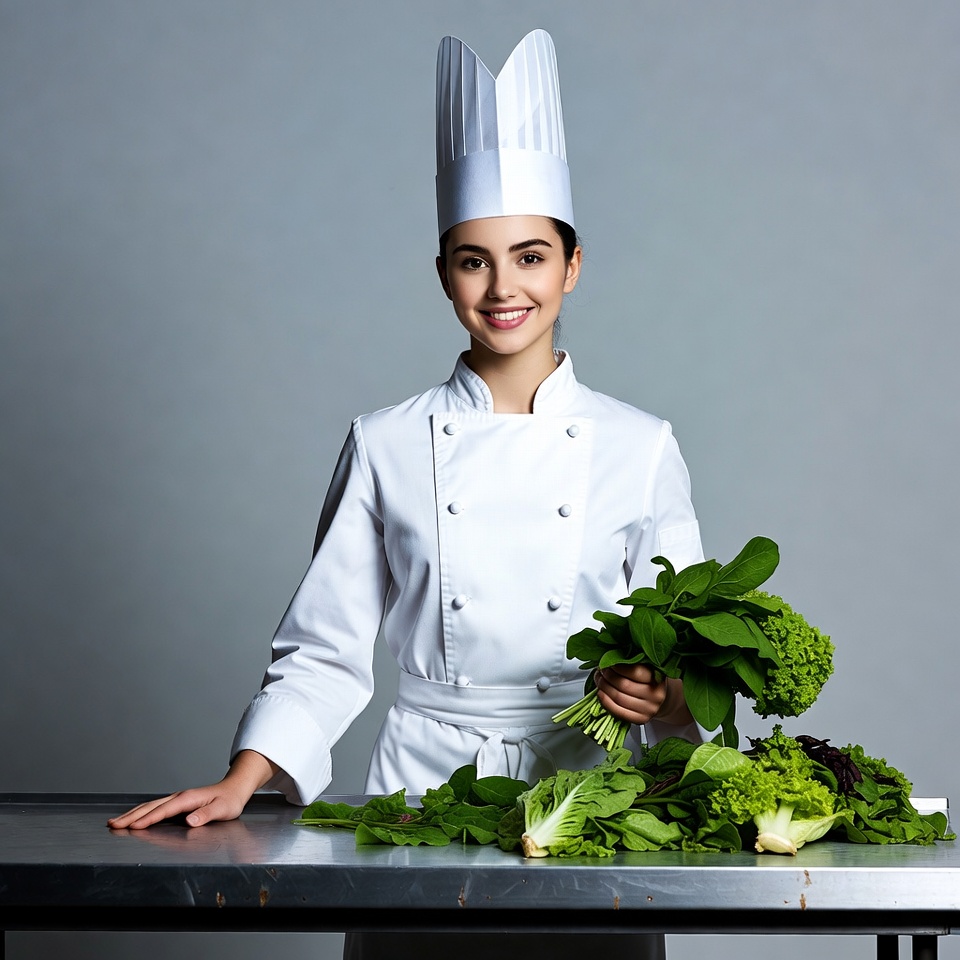 A chef is standing at a table with fresh greens and vegetables. The chef is smiling and wearing a white uniform and hat in a kitchen setting.