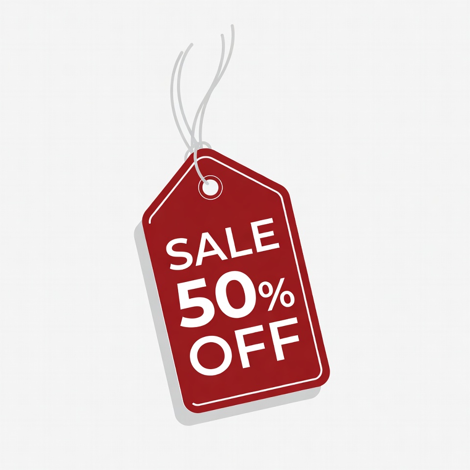 A red price tag displays a 50 percent discount. This tag is commonly used during sales to attract customers and promote items.