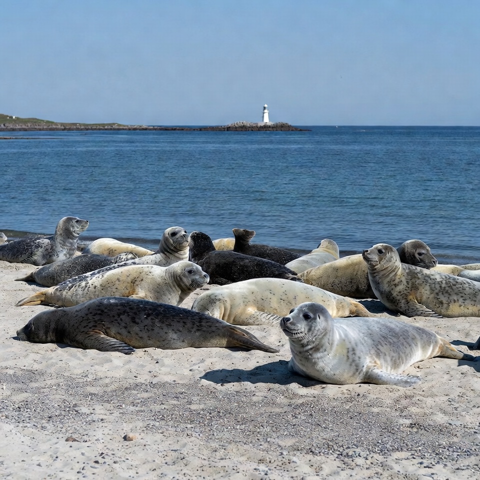 Seals are gathered on a sandy beach resting under the sun. A distant lighthouse stands by the water in clear weather.