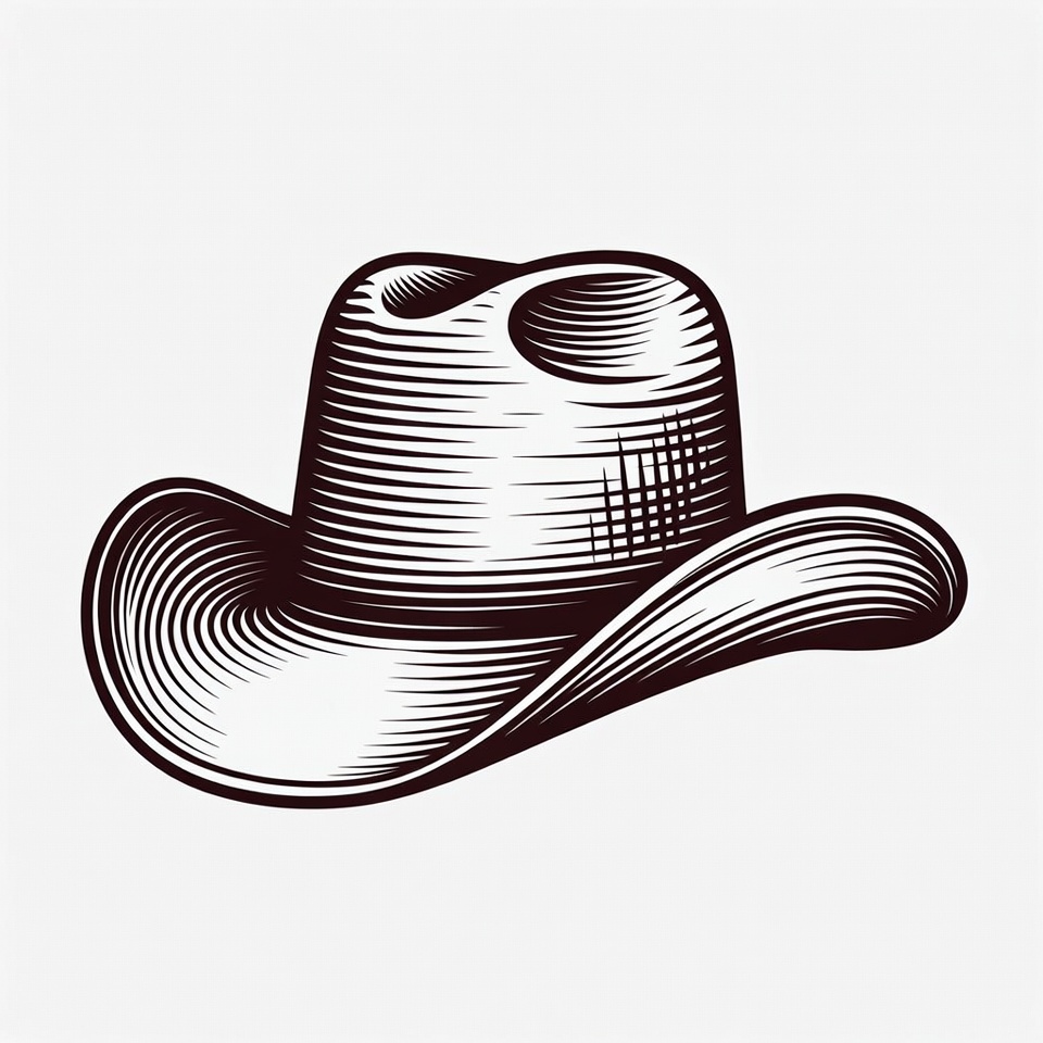 A detailed drawing of a classic cowboy hat on a plain background. The hat has unique lines and textures that show its style and design.
