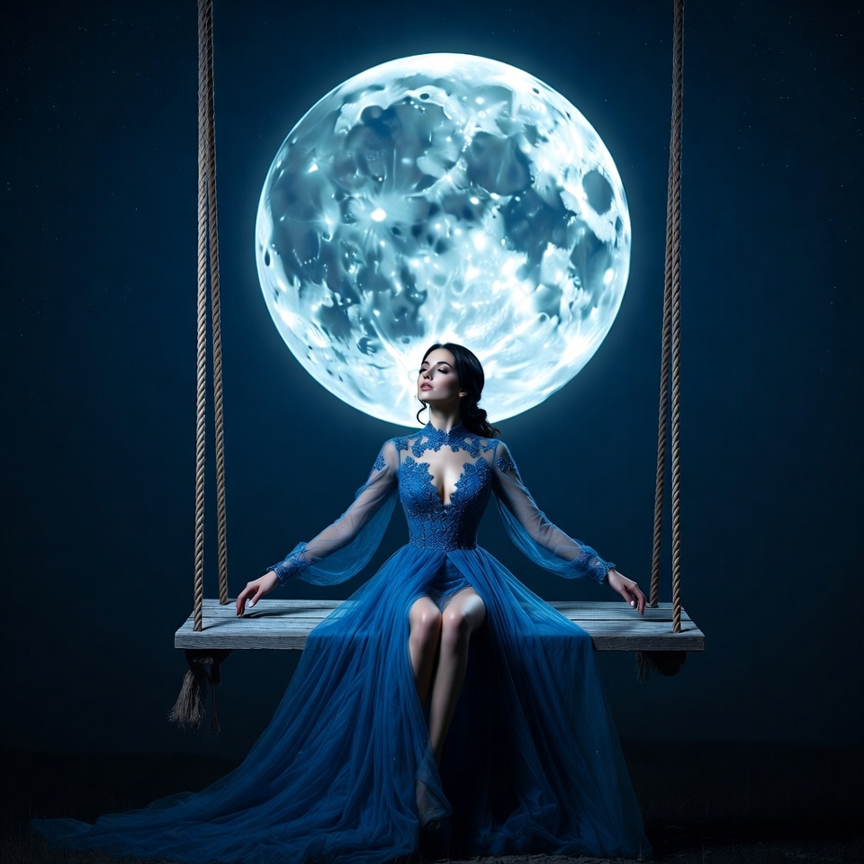 A woman is seated on a swing at night, with a large full moon illuminating the scene. She wears a blue dress and gazes thoughtfully.