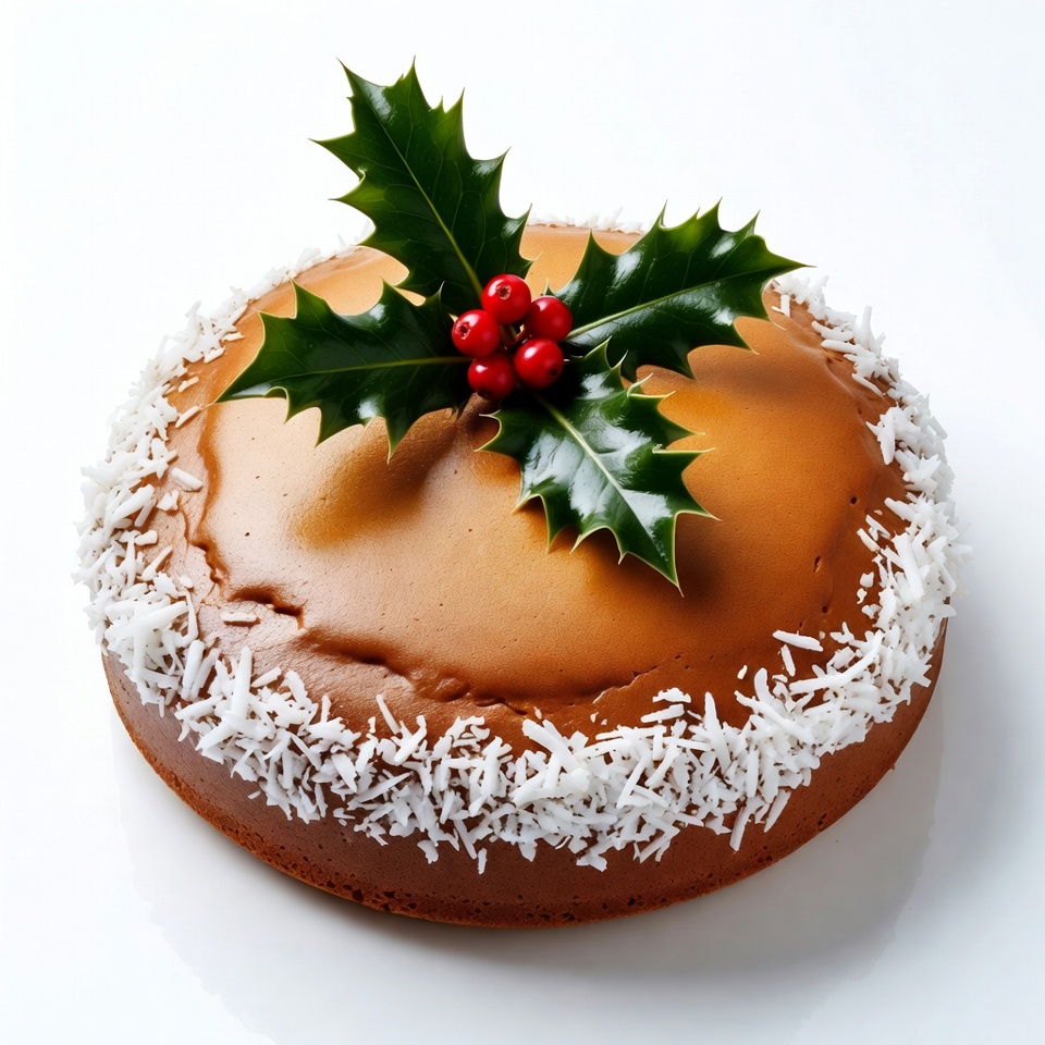 A round cake topped with holly and red berries sits on a plain surface. Coconut flakes surround the edge for decoration.