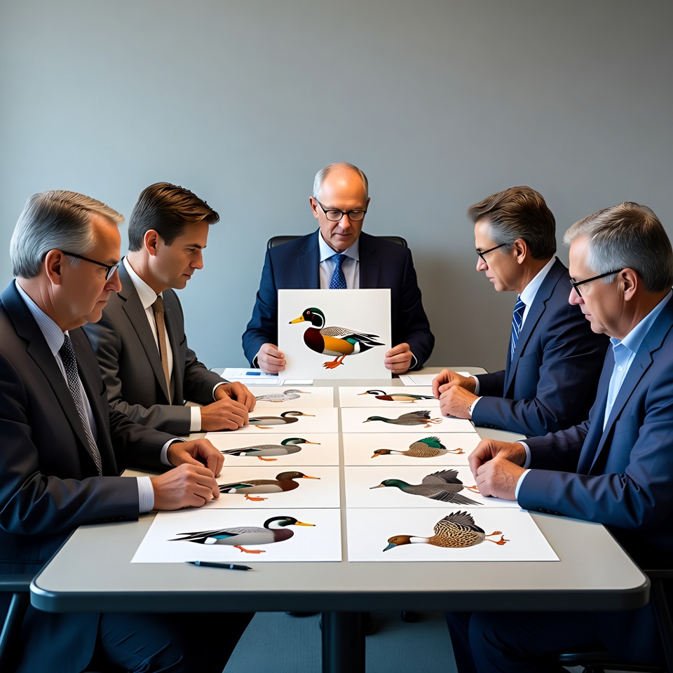 Five men sit at a table with bird illustrations in front of them. They appear to discuss the details of each illustration during a meeting.