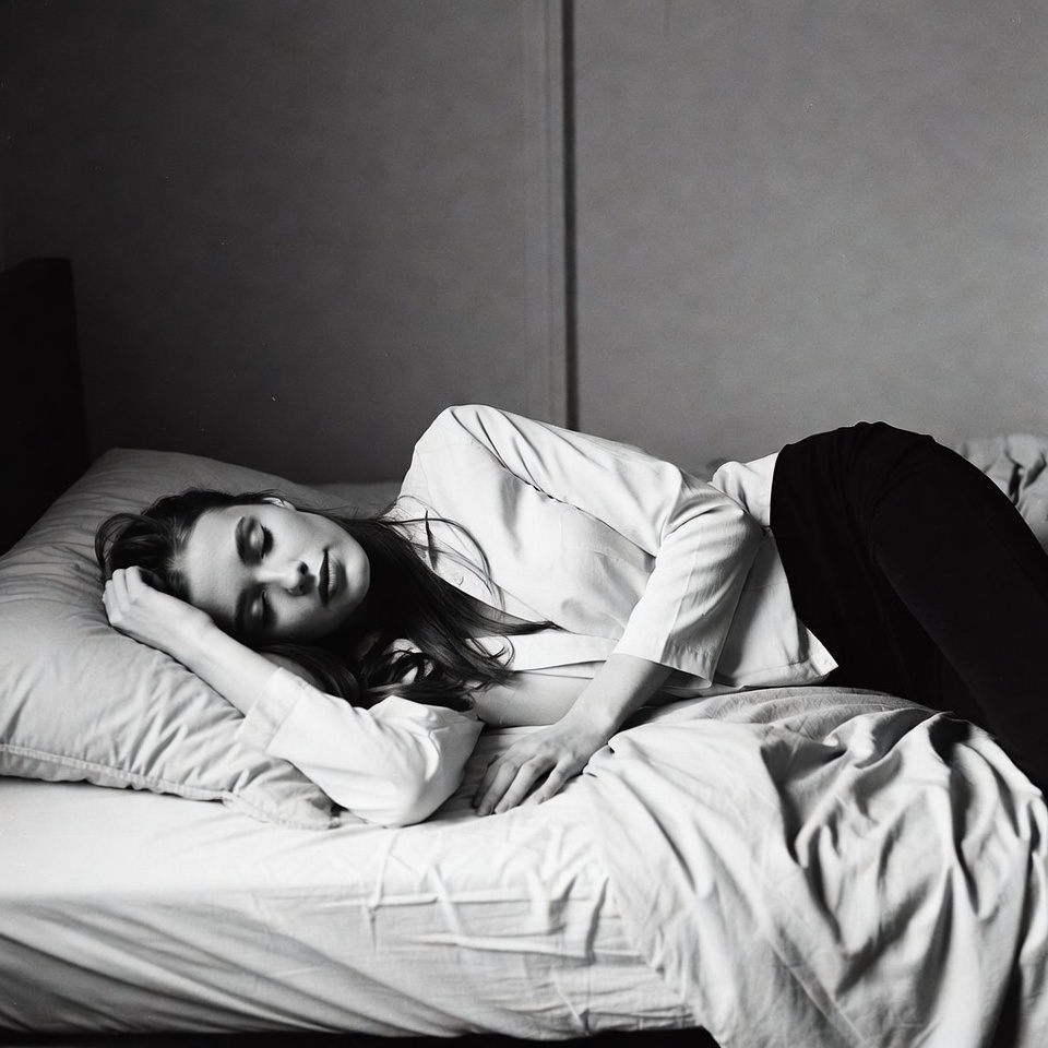 A woman lies on her side in bed, with soft morning light casting shadows on her face. She appears relaxed and peaceful.