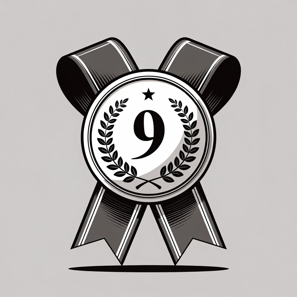 A round award ribbon features a large number nine in the center. It has decorative laurel leaves and two long ribbons below.