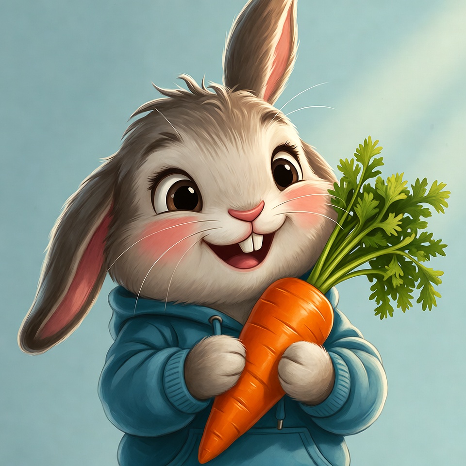 A rabbit smiles while holding a fresh carrot. The rabbit is wearing a blue hoodie. The background is light and bright.