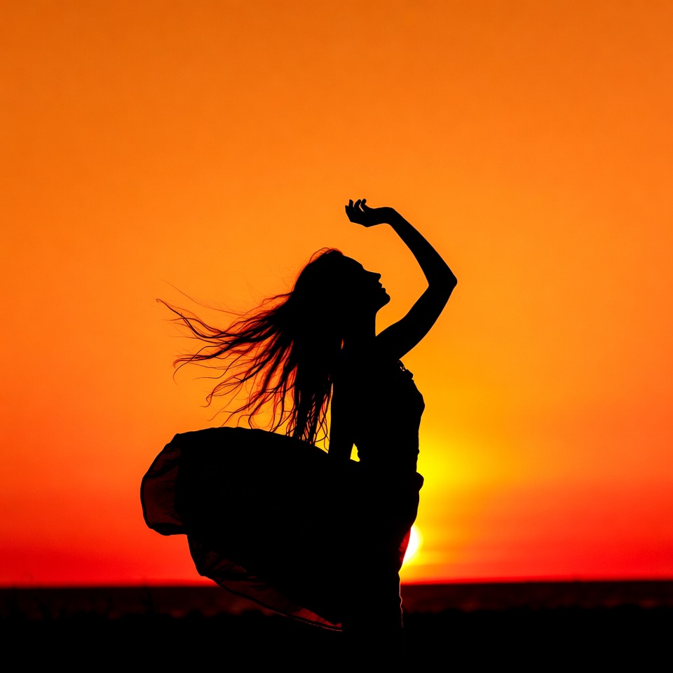 arms raised, beach, beauty, color, evening, freedom, hair, horizon, light, nature, ocean, person, sand, scene, silhouette, sky, summer, sun, sunset, waves