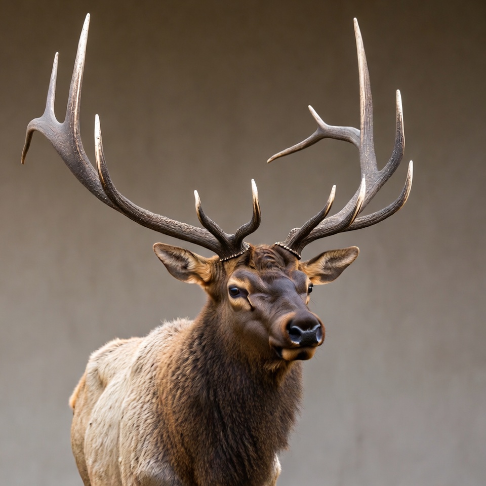 Elk with large antlers occupies a space filled with soft light. The animal looks directly at the viewer and stands still.