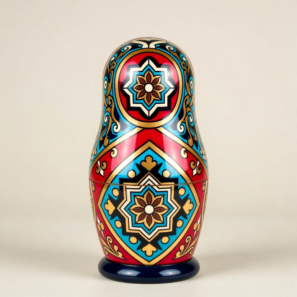 A Russian nesting doll is shown with bright colors and patterns. It is placed on a light background showcasing its design details.
