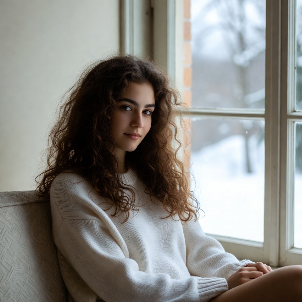 atmosphere, casual, clothing, cozy, curly hair, home, indoor, lifestyle, natural light, portrait, relaxed, season, sitting, snow, solitude, warm, white sweater, window, winter, woman