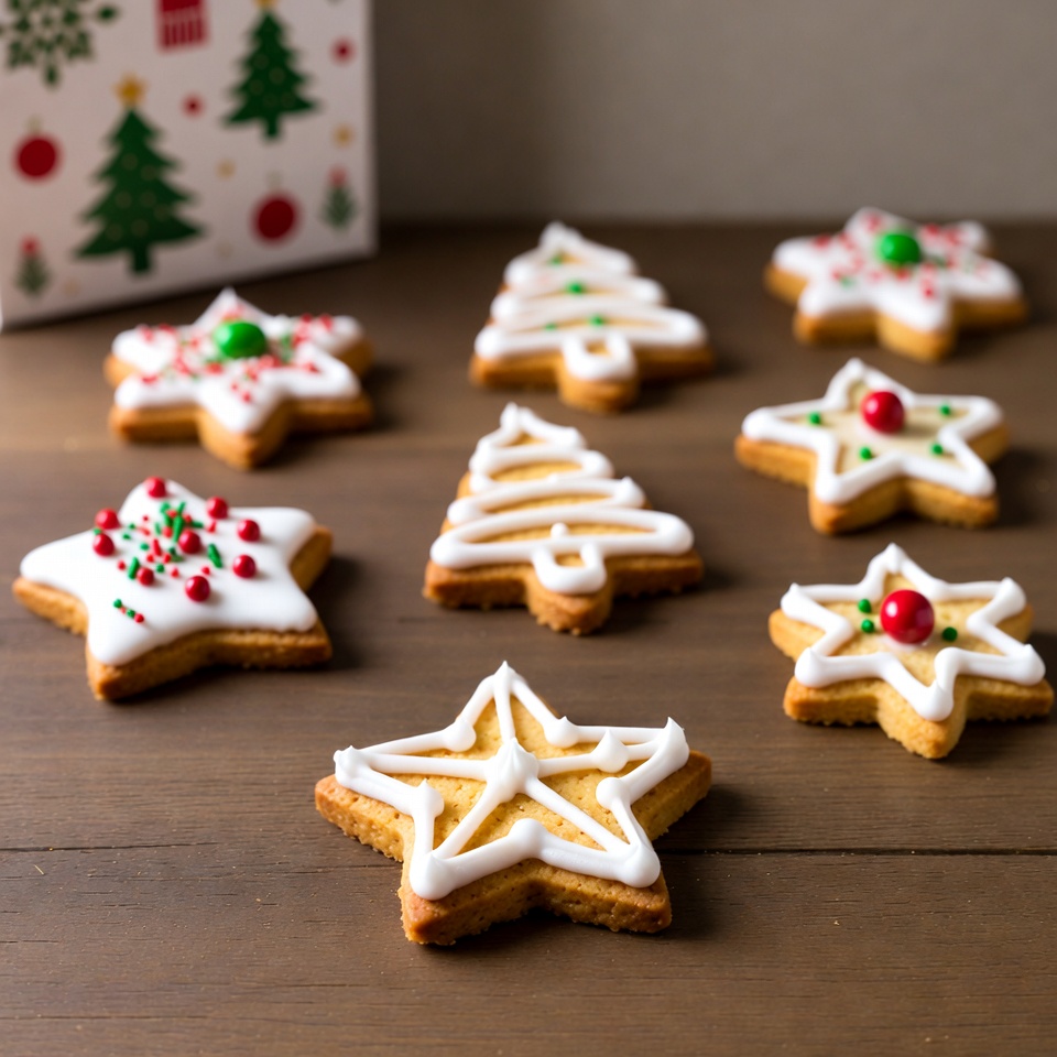 Christmas, baking, celebration, cookies, decoration, dessert, festive, flavors, holiday, homemade, icing, party, snacks, sprinkles, stars, sugar cookies, sweets, treats, trees, wooden table