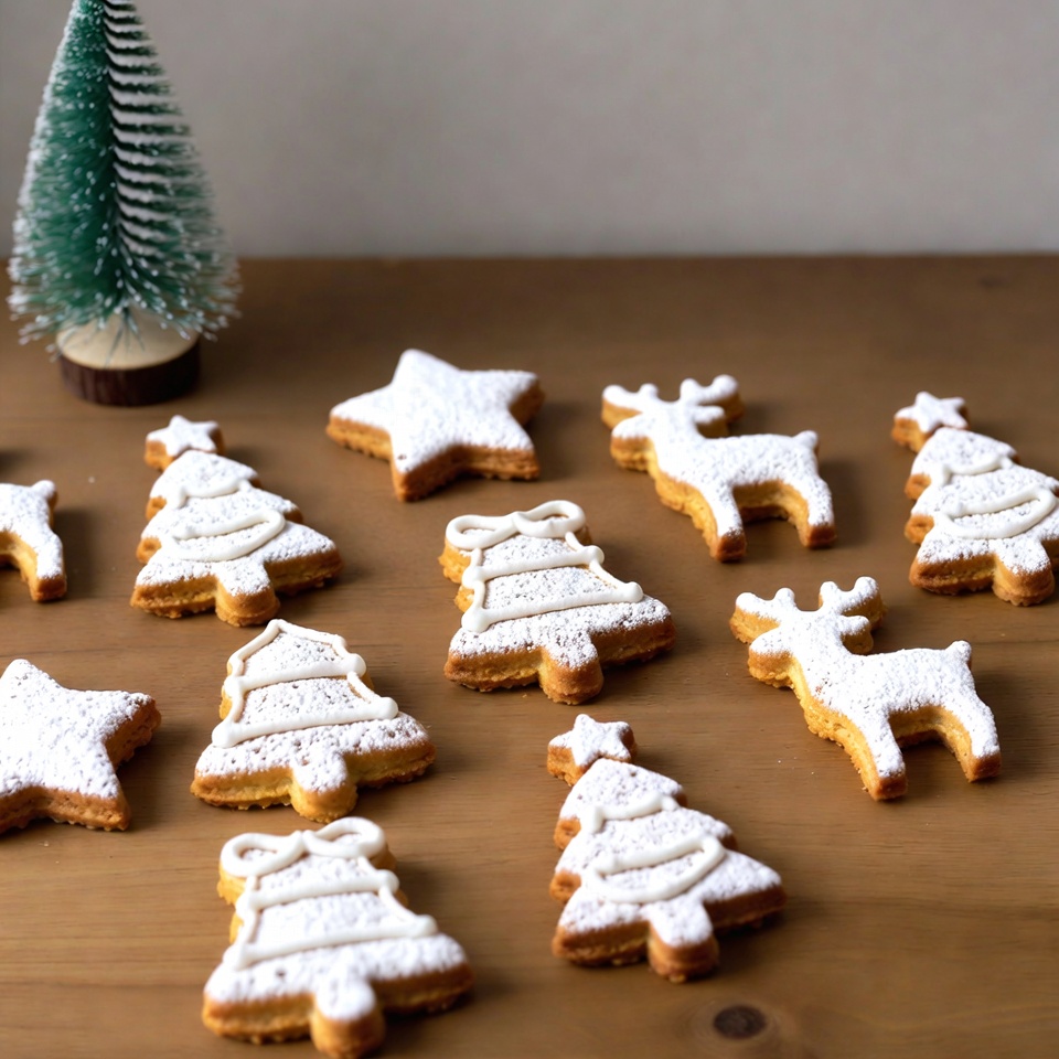 Cookies shaped like trees, stars, and reindeer are arranged on a wooden table. A small tree sits in the background.