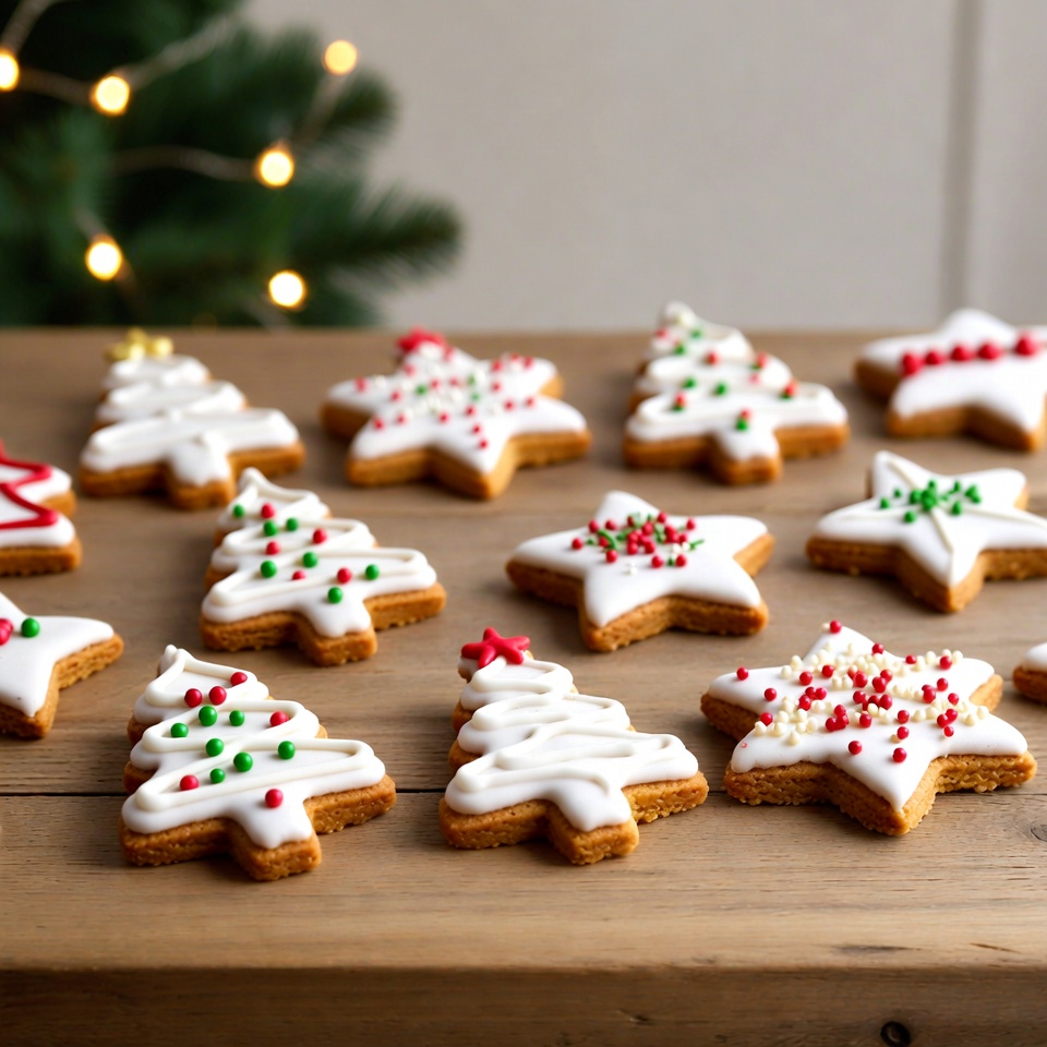 Decorated cookies in the shape of Christmas trees and stars on a wooden table. A green tree with lights is in the background.