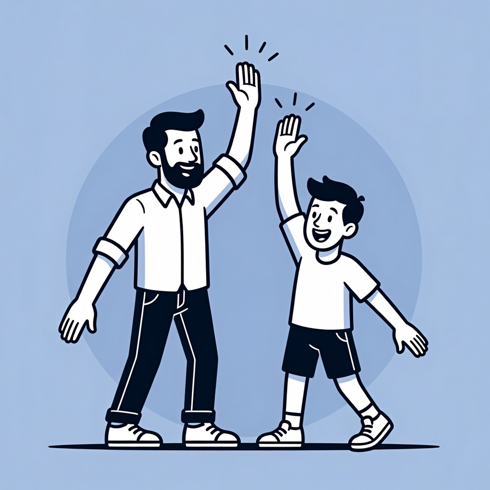 A father and son celebrate by giving each other a high five. They are smiling and enjoying a joyful moment indoors.