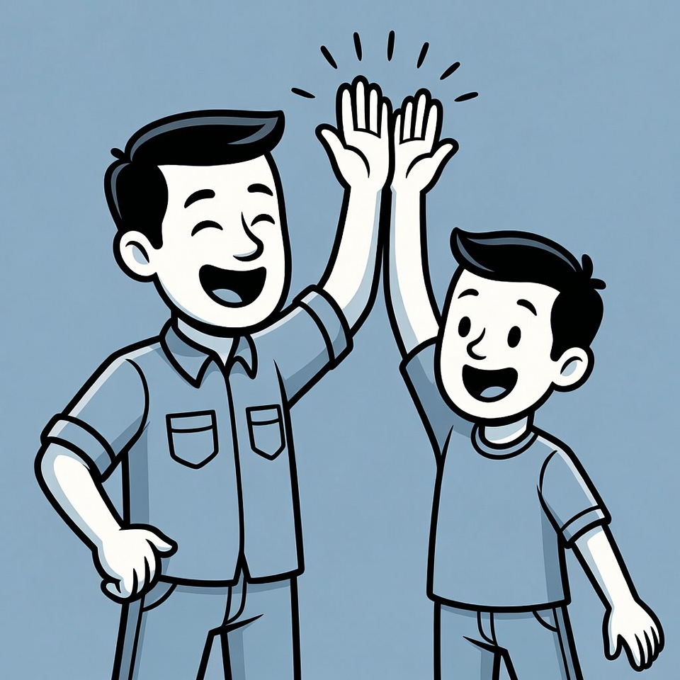 A father and son share a joyful high five indoors. They are smiling and enjoying their time together.