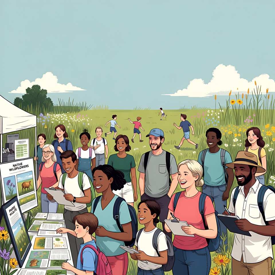 activity, adults, children, community, displays, education, event, exploration, field, flowers, fun, gathering, grass, learning, nature, nature walks, outdoors, participation, talking, wildlife