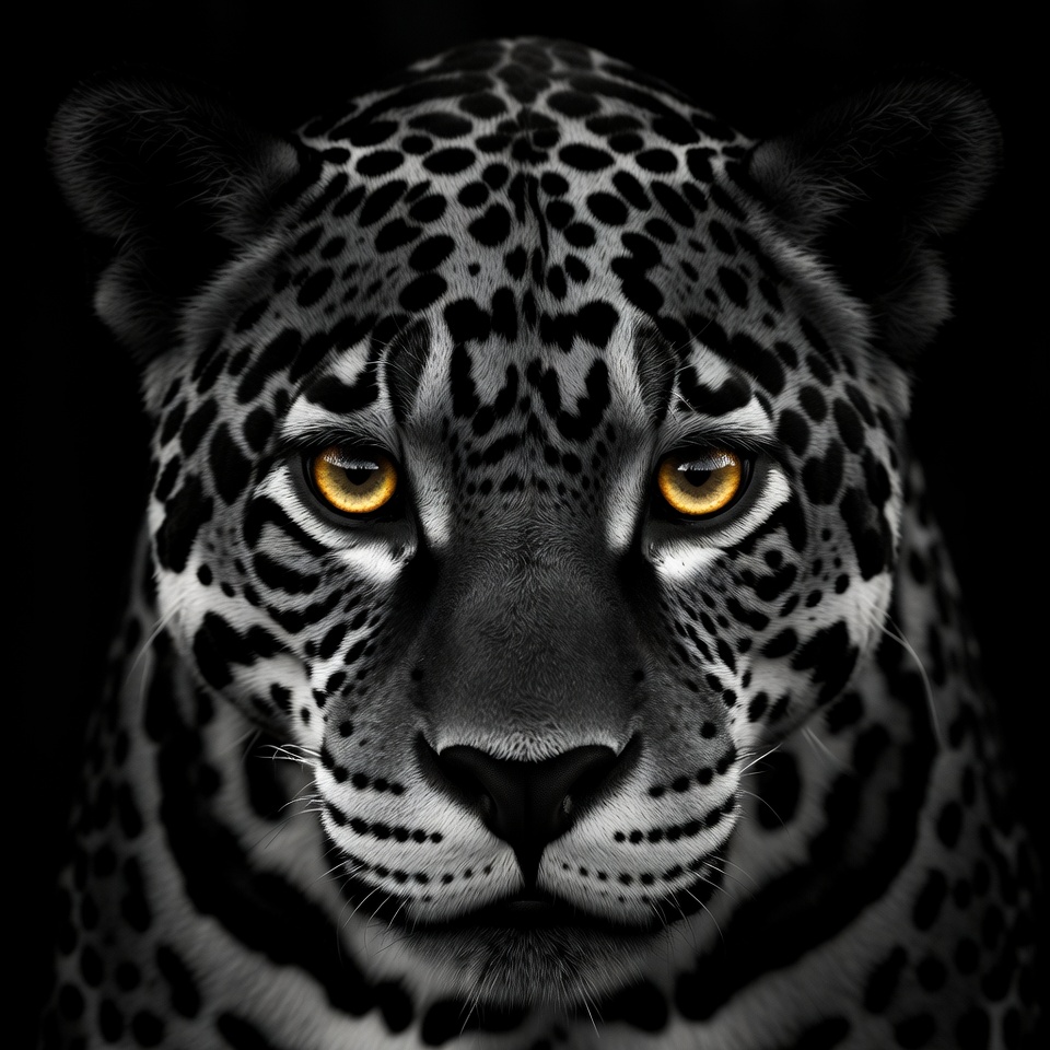 A jaguar stares directly at the viewer with intense yellow eyes and distinct black and white fur patterns in low light.