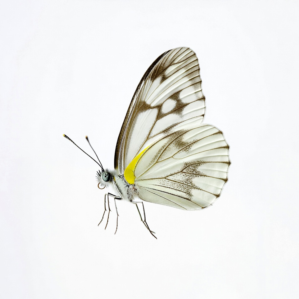 A butterfly rests with its wings open, revealing distinct yellow markings. The setting is simple with a white background.