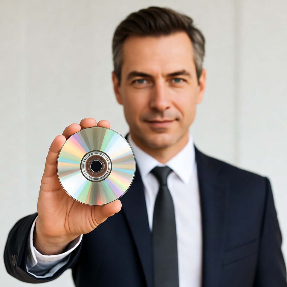 Man in suit displays a disc at a work setting, showing it clearly to the camera during a business hour.