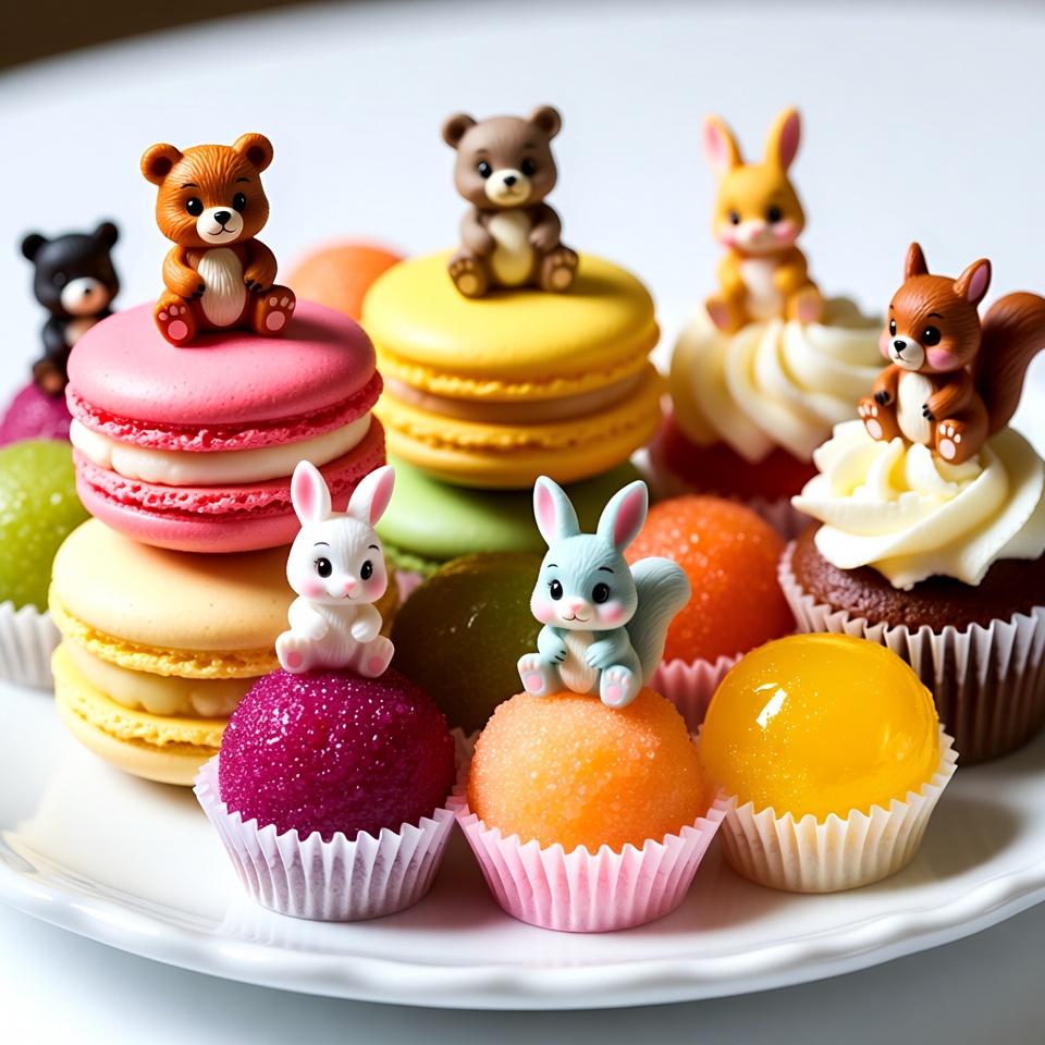 A plate features colorful macarons and cupcakes with small animal figures on top. The setting suggests a fun celebration or party.
