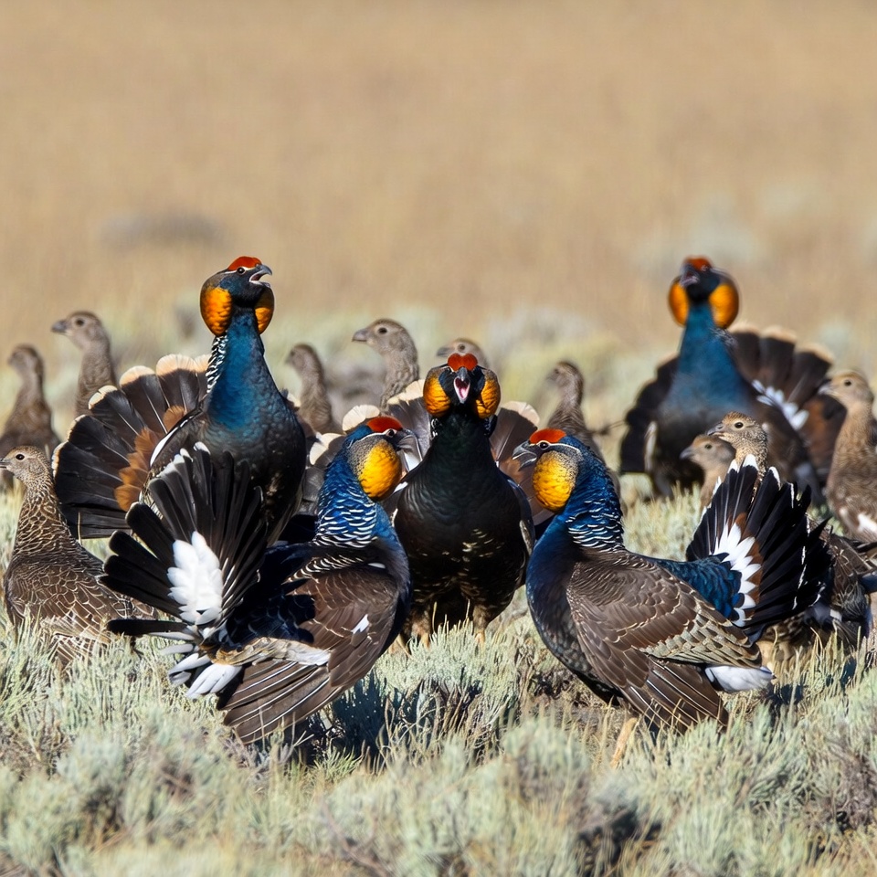 animal, avian, behavior, birds, blue, display, ecology, elks, feathers, field, gathering, grass, ground, group, habitat, nature, orange, outdoors, sunny, wildlife