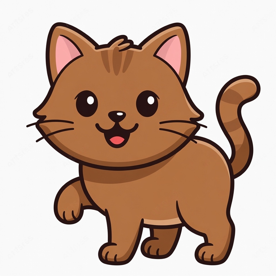 A small brown cartoon cat stands with one paw raised. The cat has a happy expression and large eyes. Its tail is curved, and it looks inviting.