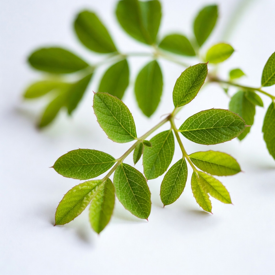 A branch with fresh green leaves lies on a white surface. The leaves showcase natural textures and shapes typical for this plant type.