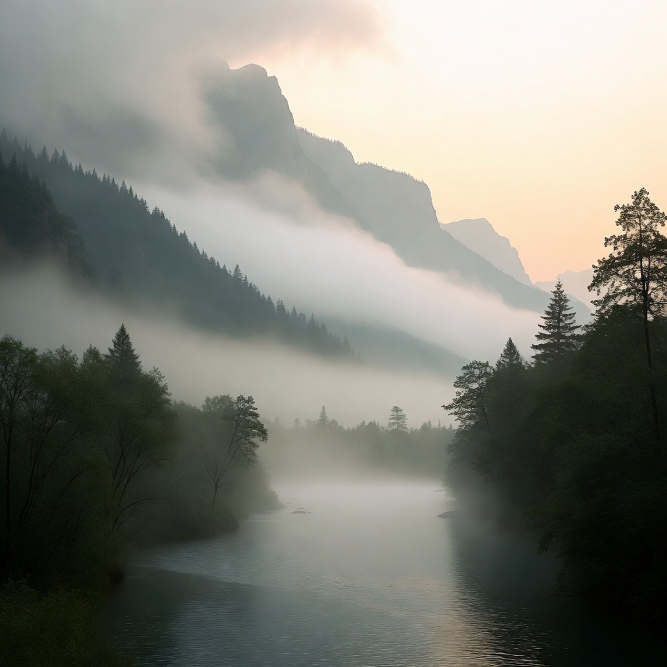 Fog covers the river as the sun rises behind the mountains in the early morning. Trees line the banks creating a natural landscape.